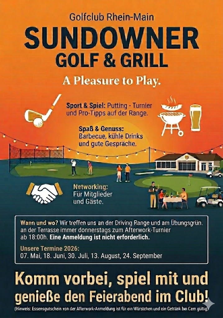 | €15Für alle Mitglieder und Golf-Interessierten. Wir feiern in den Abend hinein mit Putt-Turnier, Würstchen und Spass.